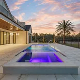 The backyard, thoughtfully positioned for privacy, features tranquil pond views and no home directly across the street. A custom mosaic tile pool and South Florida-inspired plaster finish reinforce the resort aesthetic. Upstairs, an oversized sun patio captures elevated views and coastal breezes perfect for morning coffee or sunset lounging.