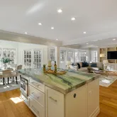 The well-appointed, fully upgraded kitchen, with a sun-drenched breakfast nook, has undergone a stunning transformation, featuring high-end appliances, dramatic quartzite countertops, an oversized center island, with room for seating, and ample storage.