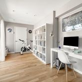 On the upper floor there is the master bedroom with walk in closet, second full bath and a bonus room that is currently configured as a home office and workout area. Look out from your home office/work out area to your own private 200 square foot terrace with Trex decking. Plenty of closets and storage throughout the apartment.