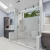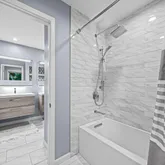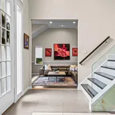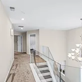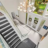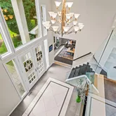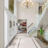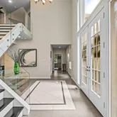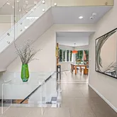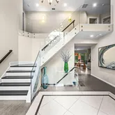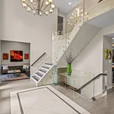 Step into a dramatic two-story foyer, showcasing a custom modern glass-panel staircase, complemented by black-painted oak stairs and striking patterned porcelain tile flooring that flows throughout the first floor. The home’s minimalist, contemporary design creates an immediate sense of openness and calm.