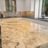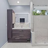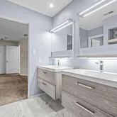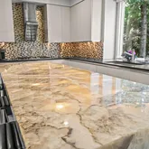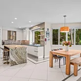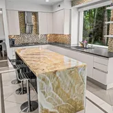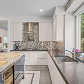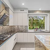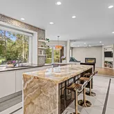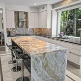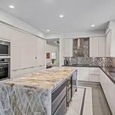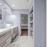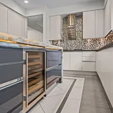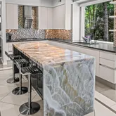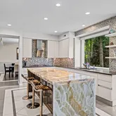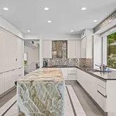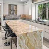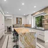 At the heart of the home, the chef’s kitchen promises memorable gatherings. A thoughtful mix of open shelving and closed cabinetry from Snaidero offers abundant storage, while the microwave, refrigerator, and oven are seamlessly built into the cabinetry to make entertaining effortless. Black granite countertops contrast beautifully against the light palette. The true showpiece? A stunning, extra-large onyx waterfall island that glows warmly with underlighting, complemented by a built-in wine fridge and additional storage.