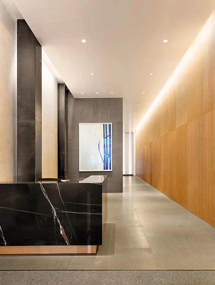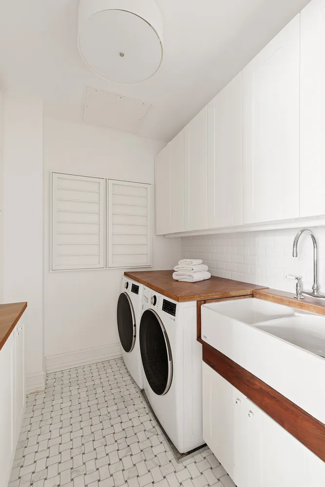 The second bedroom suite, converted from two separate bedrooms, is exceptionally large and faces east into the private courtyard. In addition to an en-suite marble bathroom with a rain shower, there is ample room for both a sleeping area and a separate lounge space. The third bedroom suite also faces east and includes an en-suite bathroom with floor-to-ceiling marble. Rounding out the area is a laundry room, complete with storage and a sink; and a gym/library with a skylight, ideal as a convertible office or exercise room.