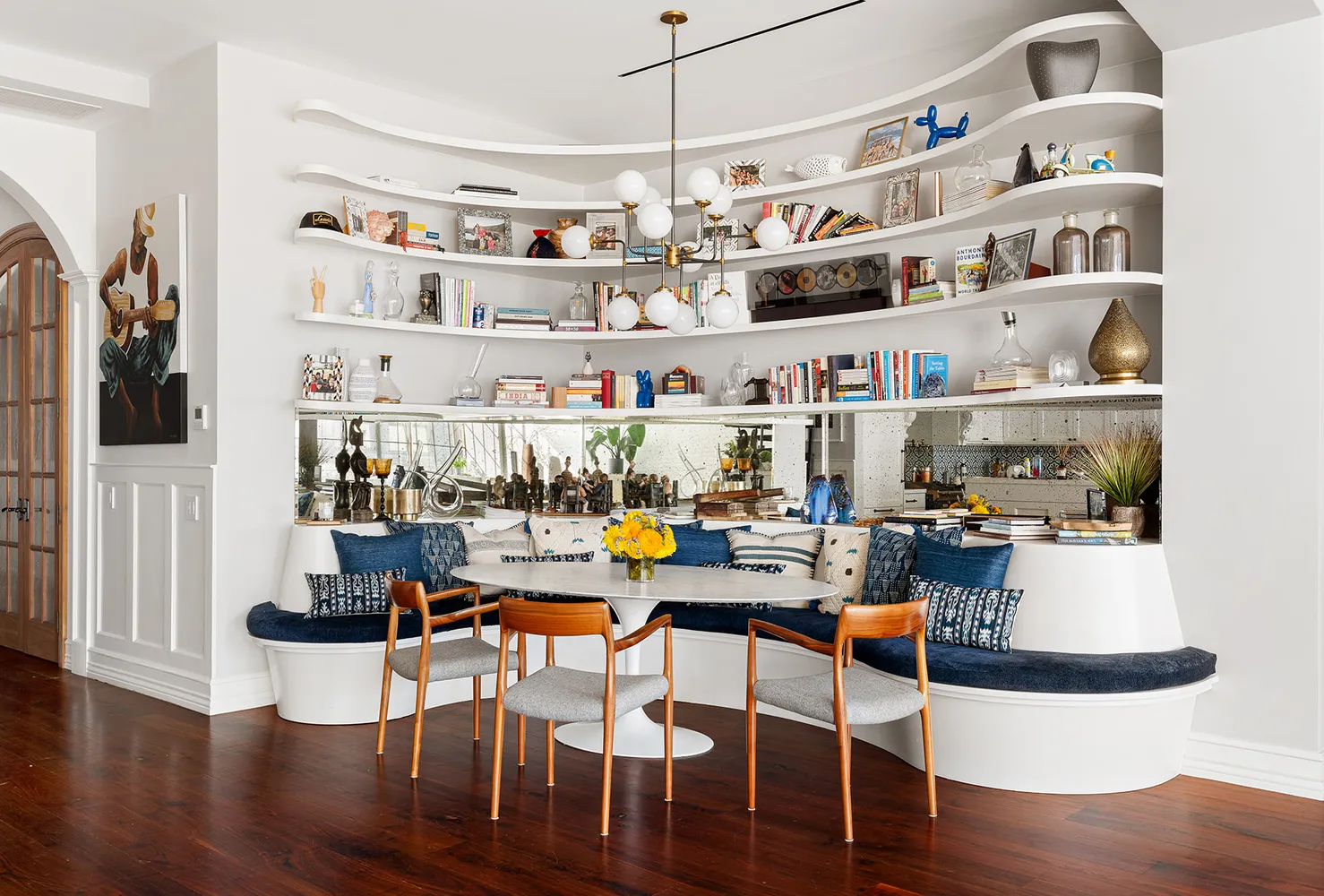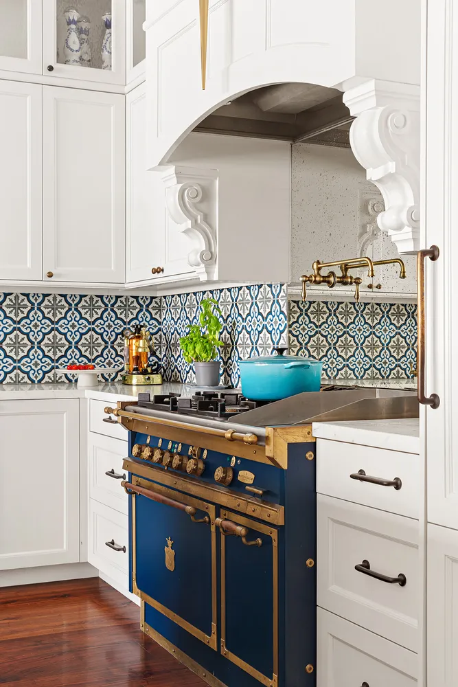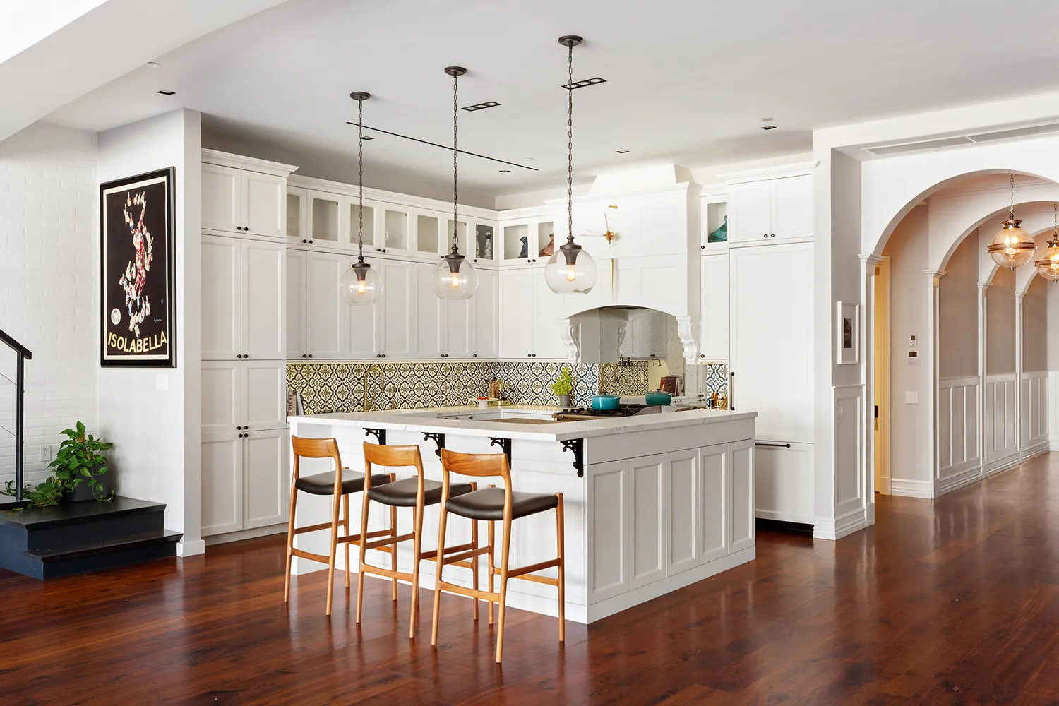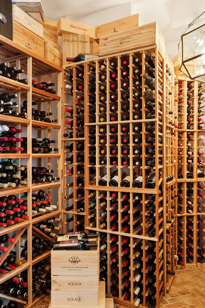 The kitchen and dining room flow effortlessly from the great room. There is a curbed banquette for leisurely dining, as well as bar seating on the kitchen peninsula and an additional work station with more counter space. The kitchen is appointed at the highest level, with an Officine Gullo Firenze range plus pasta spigot and Miele appliances including a beverage fridge.