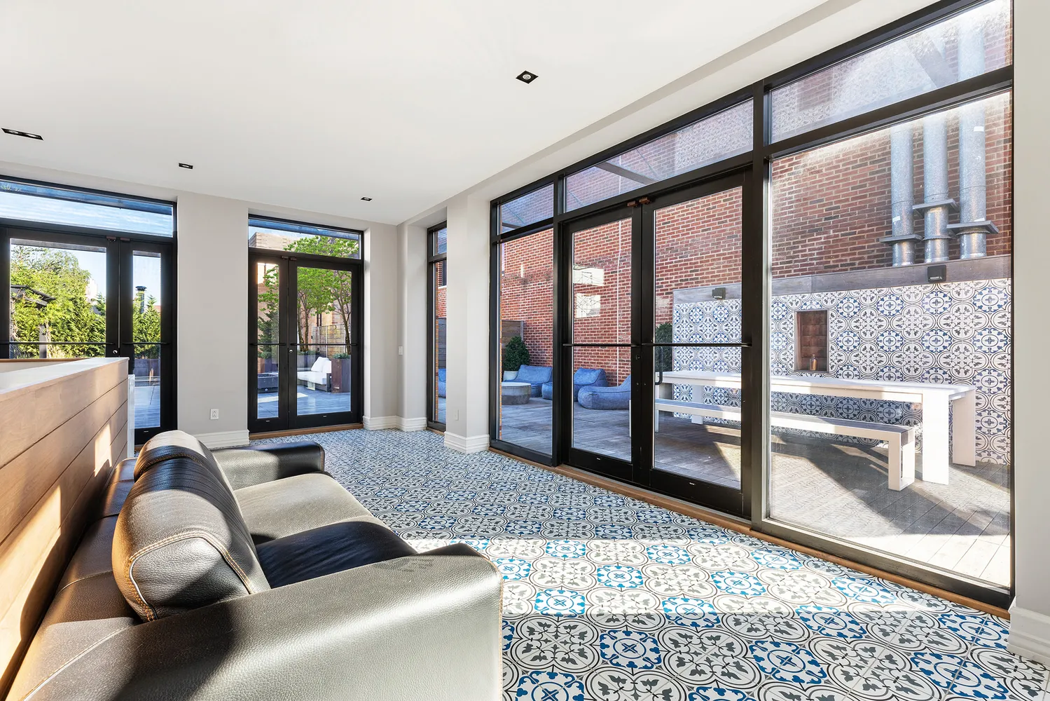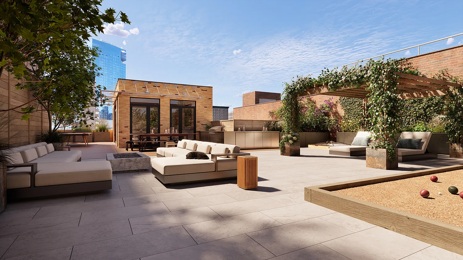 Impossible to miss is the grand staircase ascending up the north end of the room. At the top is the penthouse lounge, an intimate sitting and bar area with a 270-degree exposure to the roof terrace. Spanning over 3,000 square feet and featuring a pergola, a bocce court, an outdoor kitchen, and a view over West Broadway, the terrace is an incredibly private space that is well suited for entertaining.