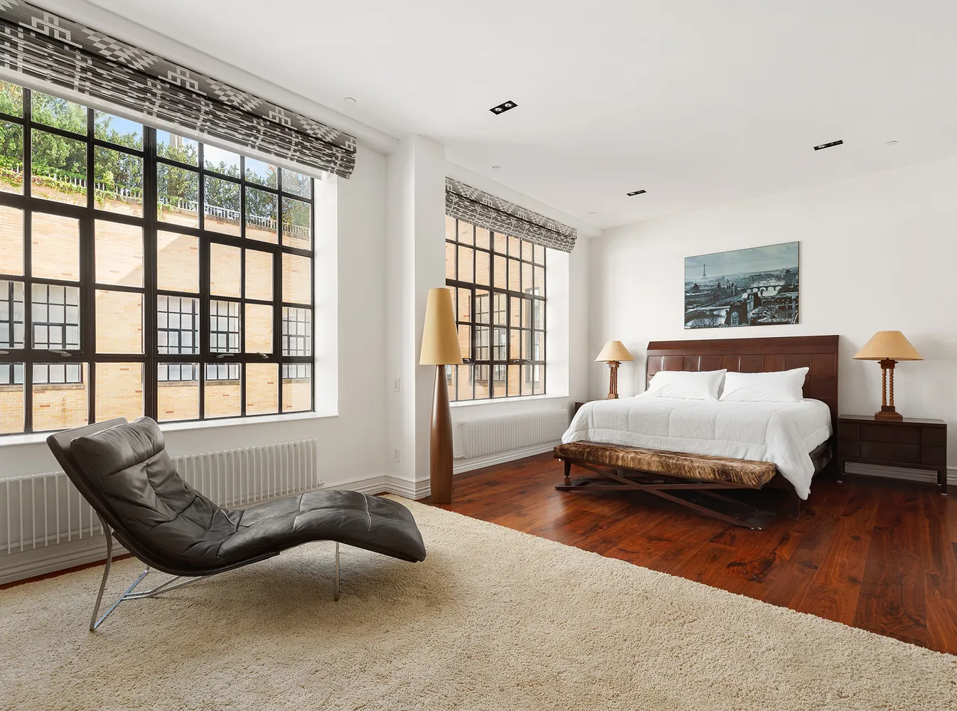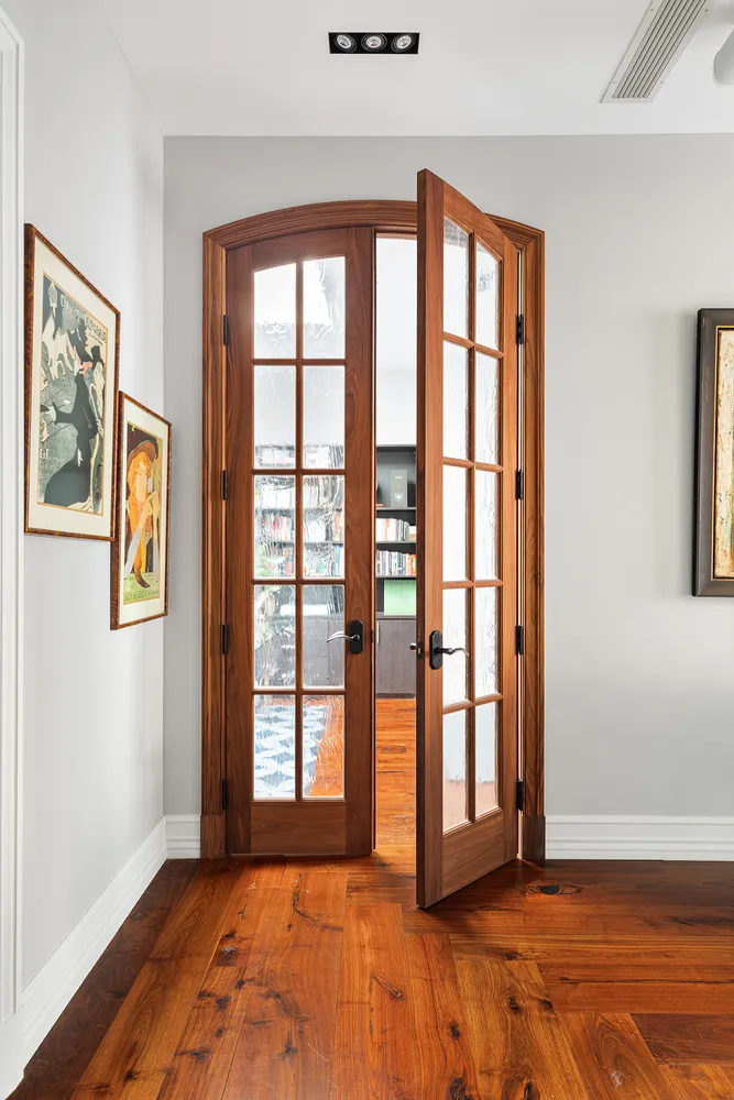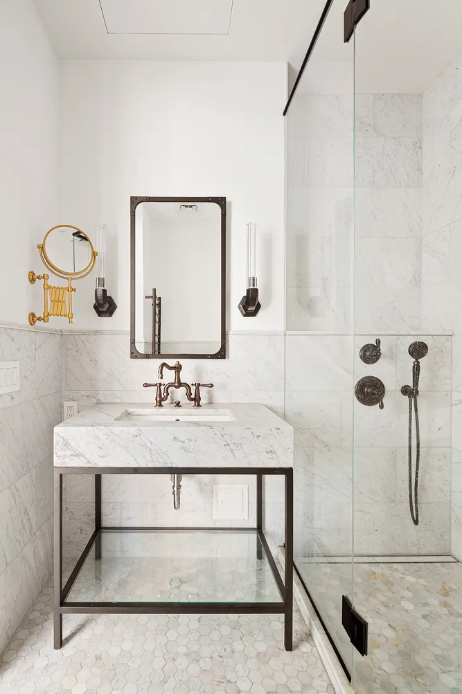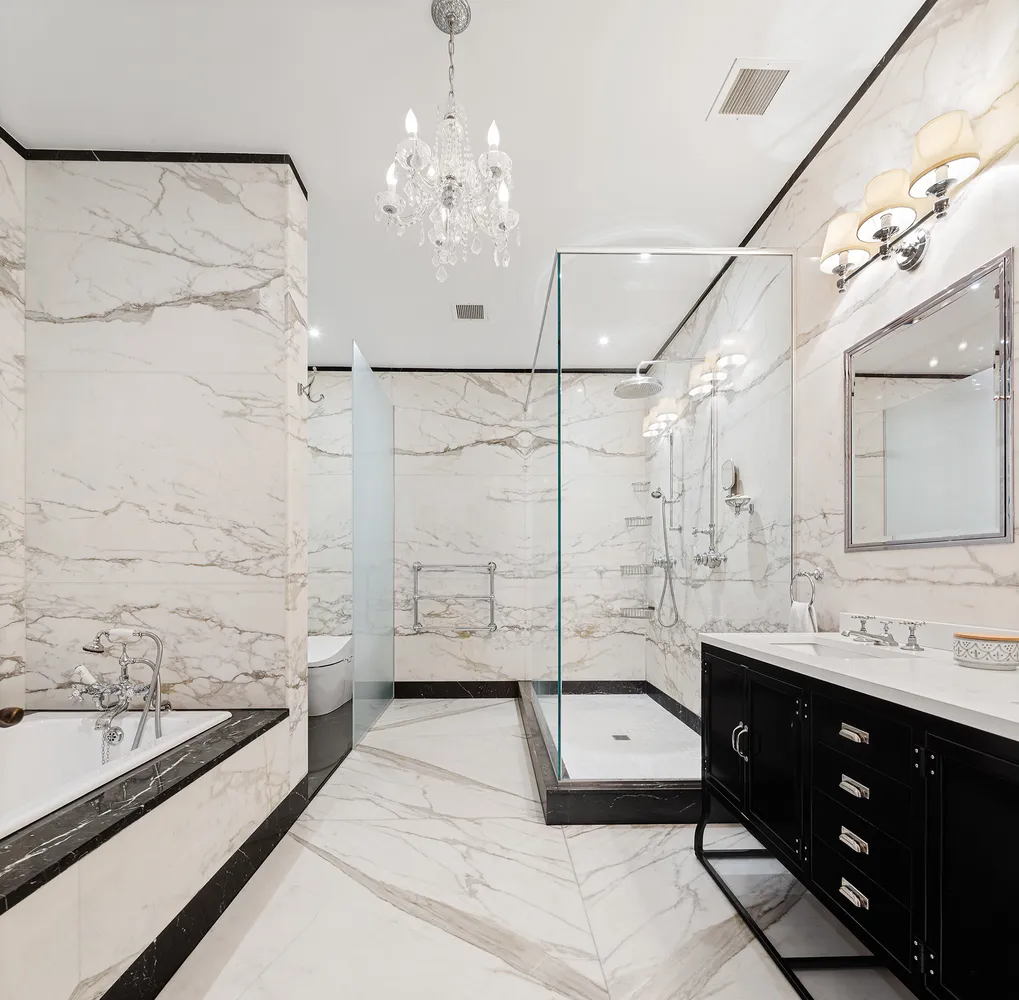 Proceed through a spacious gallery, perfect for an impressive art collection, to arrive at the principal bedroom suite. An enormous space with four closets, including a walk-in closet with custom shelving, a spa-like bathroom, and more casement windows overlooking West Broadway, the principal suite is a sanctuary. The bathroom features a rain shower and separate soaking tub ringed with black marble, Barber Wilsons tapware, floor-to-ceiling white marble, a towel heater, and a Toto automatic toilet.