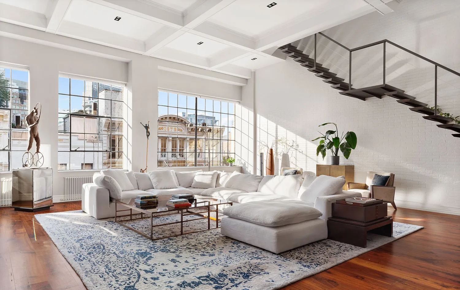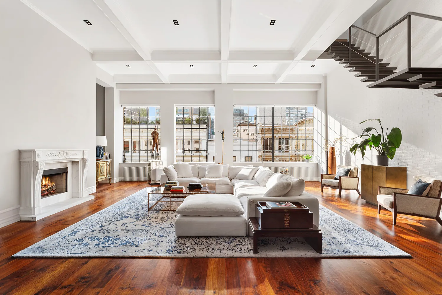 Enter the loft through the extra-wide foyer, pass under the decorative archways — past the walk-in entry closet, the climate-controlled wine vault, and a powder room — and emerge into the heart of the home: the great room. It is grand in every measure. There are original casement windows cascading western light, 15-foot coffered ceilings, recessed lighting, a full wall of original brick, and a marble gas fireplace.