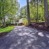 On the next level, you'll find three bedrooms. Two of the bedrooms share a hall bathroom with a tub and dual vanity, while the third has an en-suite bathroom with a walk-in shower. Another half floor up, you enter the open floor plan living, kitchen, and dining space. The kitchen boasts modern flat-front cabinetry, a double-thick quartz waterfall island, and high-end JennAir stainless appliances. There is a large walk-in pantry with additional overhead dry goods storage. Floor-to-ceiling windows flank both sides of this wonderful open living/entertaining space, filling the area with light and giving the feeling of being nestled in the trees. There's a beautiful floor-to-ceiling ceramic fireplace, a dry bar with a drink cooler, and wine storage. An additional powder room off the kitchen completes this space.