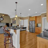 - Kitchen Features: Breakfast Bar, Cabinets Stain, Eat-in Kitchen, Kitchen Island, Pantry Walk-In, Stone Counters, View to Family Room, Wine Rack
