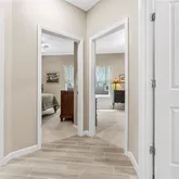 office double windows and a spacious beautiful field in the rear. This field is full of bluebirds and red winged blackbirds that open up your morning with song. The east facing Master bedroom and lanai enjoy the privacy and expansive view in all seasons, with afternoons and evenings without the heat from the sun. The owner has added brand new gutters, Llumar window tinting to cut sunlight and glare, a built -in surge protector, and a garage with epoxy flooring and brand new contemporary paint throughout the home. Dimmers have been added for the extensive LED lighting in the LR, DR, and Master Bath. The home is wired for pendants and a chandelier as well. Irrigation has been updated, with many replacements made so that your yard can be easily maintained. This particular Halle model uniquely offers a distinct ‘beam’ separation that clarifies the Kitchen/Dining area from the Living Room. This kitchen features a generous 7ft+ of beautiful quartz counters surrounding an extra large ‘country kitchen’ sink. The 42” cabinets are exquisite providing lots of storage space. Bathrooms are state of the art, offering 3 different shower heads in the Master walk-in shower, and a roomy second bath with another