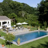 A 50' x 20' heated gunite pool anchors the manicured grounds, complemented by a separate 10-person spa. A charming pool house offers additional convenience with its own bathroom and kitchenette—perfect for long summer afternoons.
