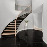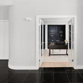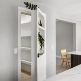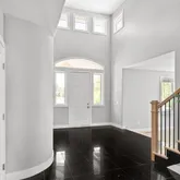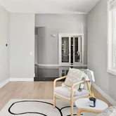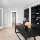 - Room Description: This stylish home office blends comfort and function with ease. Wide plank COREtec Plus flooring, crisp white baseboards, and soft recessed lighting create a clean, modern feel. A built-in black wall unit offers adjustable shelves and storage, while large triple windows fill the space with natural light. French doors add a touch of charm, and the convenient connection to the powder bath makes it all the more practical.