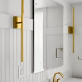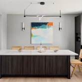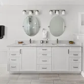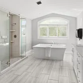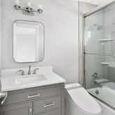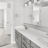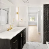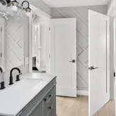 - Room Description: This thoughtfully designed powder bath offers modern elegance and functional comfort. COREtec Plus wide plank flooring and crisp white baseboards set a clean foundation, while decorative wall trim adds a touch of texture. A sleek vanity with quartz countertop provides ample storage, enhanced by matte black fixtures, a contemporary wall-mounted mirror, and a striking modern light fixture. The Woodbridge bidet completes the space with elevated ease.