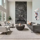 A curated, ultra-modern lighting package graces the home, enhancing the dramatic living room where soaring ceilings and floor-to-ceiling stonework frame a striking fireplace. A private home office with custom built-ins offers a perfect retreat for work or study.