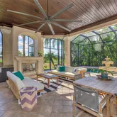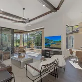 In the sought-after, maintenance-free Greystone enclave of Lakewood Ranch Country Club, this completely remodeled Neal Signature residence offers five bedrooms, four-and-a-half baths, a private office, and an expansive upstairs guest retreat, all positioned to capture sweeping, unobstructed golf course views. Situated on an expansive 1/3-acre homesite with no homes directly in front or behind, the property offers open views and a peaceful setting ideal for outdoor living. A paver driveway and inviting custom wood entry door set the tone, while inside, stunning wood-look porcelain tile flows seamlessly throughout the main living areas. Architectural details—including soaring tray ceilings, crown molding, wood beam accents, refined millwork, and designer lighting—create a warm yet elevated aesthetic throughout the home. A formal dining area framed by an aquarium window overlooks the sparkling pool and lush fairways beyond. The gracious living area is filled with natural light and serene views, anchored by a floor-to-ceiling tiled gas fireplace that serves as a striking focal point. At the heart of the home, the chef’s kitchen is beautifully appointed with custom floor-to-ceiling cabinetry, premium Cambria quartz countertops, a generous center island, and a top-tier appliance suite including Sub-Zero, Thermador, and Wolf with a dedicated wine and beverage station. The adjacent family room is rich in character, featuring dramatic wood-beam ceilings, a custom limestone feature wall, and seamless access to the lanai through 10-foot pocketing sliders, blending indoor and outdoor living effortlessly. The primary suite serves as a private retreat, complete with dual custom walk-in closets, electric window treatments, and a spa-inspired bath with elevated stone finishes, a luxurious soaking tub, and a multi-valve, state-of-the-art walk-in shower system. Upstairs a private guest retreat with a full bath, loft, and balcony overlooking the golf course—ideal for extended stays, multi-generational living, or a secondary living space. Outdoor living is equally impressive, featuring an expansive covered lanai with tongue-and-groove ceilings, a gas fireplace, summer kitchen, and generous areas for dining and lounging. A heated saltwater pool and spa are perfectly positioned to capture peaceful golf course views, creating a true resort-style setting. Recent enhancements include fresh interior and exterior paint, upgraded LED lighting throughout, and refreshed paver surfaces. Additional upgrades include three new Carrier HVAC systems and insulation (2026), SONOS surround sound, water softener (2024), Zephyr air purifier (2021), central vacuum, EV-ready outlet, Hunter Douglas shades, and finished custom closet solutions throughout. The oversized 4-car garage features epoxy flooring, built-in cabinetry, and overhead storage. Residents of Lakewood Ranch Country Club enjoy an exceptional lifestyle with OPTIONAL membership to championship golf, tennis and pickleball courts, fitness facilities, resort-style pools, and a vibrant social calendar—all just minutes from Sarasota’s beaches, dining, and cultural attractions, and within a top-rated school district.