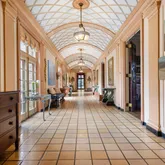 Upstairs, the home is anchored by a dramatic gallery-style hallway with soaring barrel-vaulted ceilings and abundant natural light. At each end of the upper level, two expansive primary bedroom suites create private retreats, each with its own fireplace, sitting or lounge area, bathrooms, dressing areas, and views over the gardens. There are two other large bedrooms with interior bathrooms in the main hall. Two additional bedrooms have bathrooms across the hall. There is also a second-floor laundry.