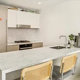 Sleek, modern kitchen with matte lacquer cabinetry, Carrara...Modern 1? Bedroom Condo in Iconic East Village Boutique Building