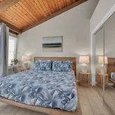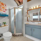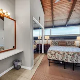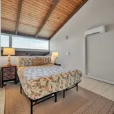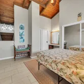 The first-floor bedroom boasts large windows with serene mountain views and ample closet space. A full bathroom with a tub/shower combo and an in-unit washer/dryer add to the home’s functionality. The open-concept living area flows seamlessly to the lanai—perfect for relaxing or entertaining with panoramic ocean vistas.