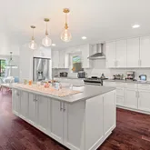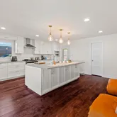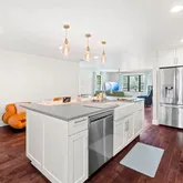 The kitchen is a study in clarity and function: clean white cabinetry, sleek countertops, and a central island that acts as both anchor and axis. It’s a place where morning coffee, evening meals, and spontaneous conversation all find their orbit.