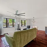 A wide, open-concept living space unfolds with the kind of scale—2,064 square feet—that invites both gathering and reflection. Natural light streams through expansive windows, illuminating rich wood floors that ground the space in warmth. The living, dining, and kitchen areas exist not as separate entities, but as a unified field—each element interacting, each contributing to the whole.