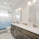 -Oversized primary suite with dual walk-in closets, double quartz vanity, frameless glass shower, and backyard access