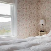 Just off the living room is a bright central dining and sitting area, anchored by a stunning floor to ceiling window that frames sweeping mountain views, the ideal setting for entertaining, or simply relaxing with a book and taking in the scenery. Nearby, a smaller first-floor room, currently used as a bedroom, offers flexibility for a home office, library, or guest room. A full bath completes the main level for convenience.