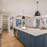 appliances, a large island, and walk-in pantry, opening seamlessly to the living and dining areas. A private home office and
