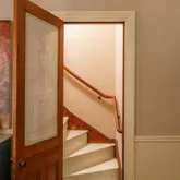Your first step inside feels like a love letter to the past. Through the original wood door, find a marble vestibule with pressed paper wallpaper leading to a foyer and staircase where newel post and turned balusters remind you of the home’s Gilded Age origins. Paneled walnut doors with original Eastlake hardware separate the parlor from the foyer in classic Victorian spatial planning.