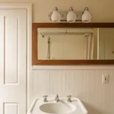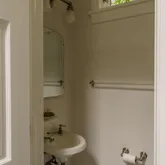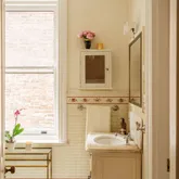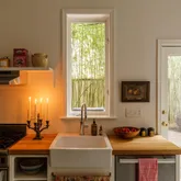 In the kitchen, history settles comfortably into modern life. A Wolf range, Fisher & Paykel refrigerator, and Miele dishwasher are juxtaposed with an original butler’s cupboard, a deep farmhouse sink, and marble tile floors. A sun-soaked breakfast room with a skylight and an attached powder room provides the conveniences of contemporary living. Out back is a bluestone patio sanctuary framed in bamboo, a beautiful continuation of the living space—perfect for evening cookouts, dinner parties, and container gardening.