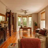 Bathed in soft natural light, here in the parlor, time seems to slow. Yellow pine floors glow with more than a century of footsteps, and every doorway is framed in original millwork; every window, deep-cased. Light pours through tall sashes and stained glass, shifting gently across the floors as the day moves on. High ceilings are lined by graceful plaster crown molding. The decorative fireplace with a tiled hearth of figural motifs, fluted pilasters, and carved ribbons anchors the room with quiet grandeur. It’s the kind of space that invites morning coffee rituals and long afternoons curled up with a good book.