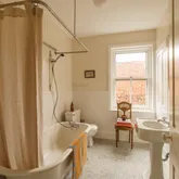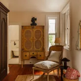 The en suite primary and attached boudoir are as elegant as they are practical. The bathroom with its delicate Victorian tile and clawfoot tub, and the bedroom’s floral-carved built-in closets offer authenticity and grace. This suite lives like a sanctuary—lush and private.