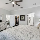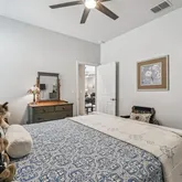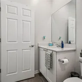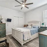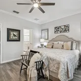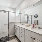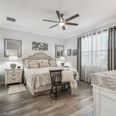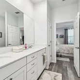 The owner’s suite is a serene retreat with a large picture window, generous walk-in closet, and spa-inspired bath featuring double vanities, tiled walk-in shower, and quartz surfaces that echo the home’s clean, modern aesthetic. A well-appointed guest bedroom and bath provide comfort and privacy for visiting friends and family.