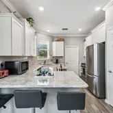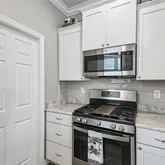 The kitchen shines with quartz countertops, white shaker cabinetry, stainless steel appliances, and an inviting breakfast bar—perfect for morning coffee or casual entertaining.