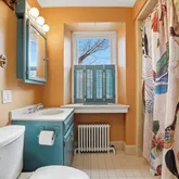 Three bedrooms are on the second level, as well as two full bathrooms that have tub/shower combos. The primary bedroom features its own ensuite bathroom. The main bath on this level shines with natural light and a beautiful botanical wallpaper. There is also a Juliet balcony on this level, which is accessible through the secondary bedroom.
