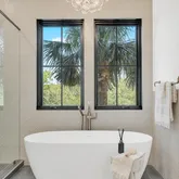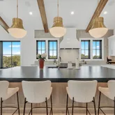 A built-in drop zone near the pool provides the perfect place to stash beach towels and outdoor gear after a day in the sun. The primary suite, tucked privately at the back of the home, is a true sanctuary featuring a wood accent wall, beamed ceiling, stylish pendant lighting flanking the bed, and slider doors that open to your backyard oasis. The primary bath offers a spa-like experience with a freestanding soaking tub, custom inset cabinetry, Silestone quartz countertops, and beautiful tilework throughout.