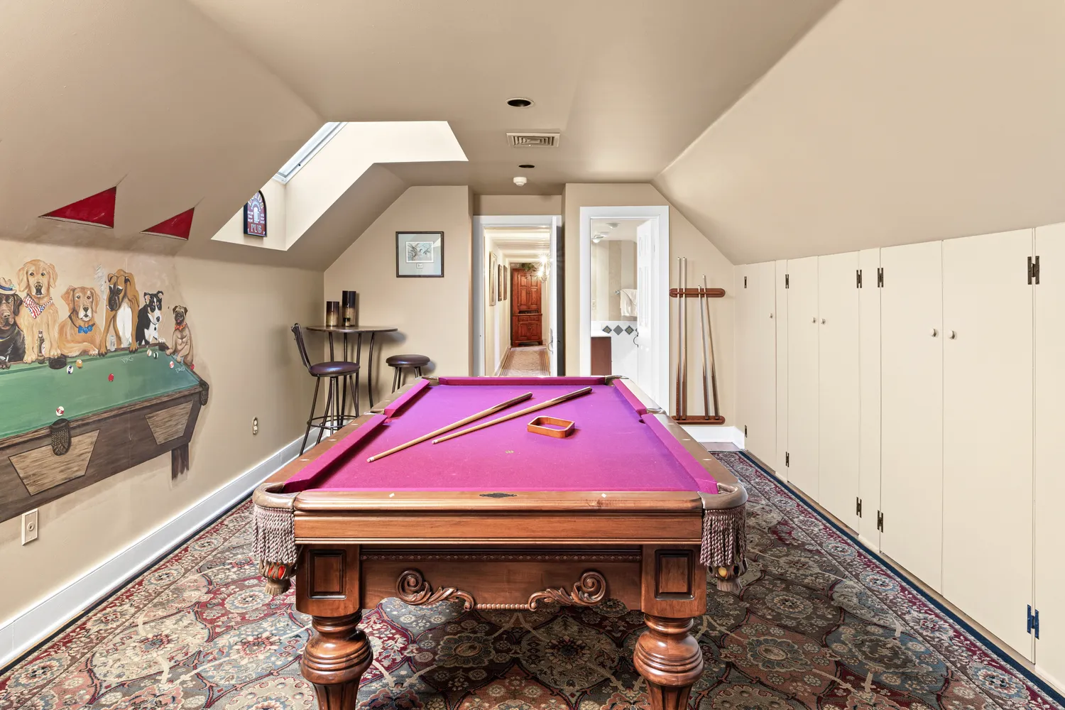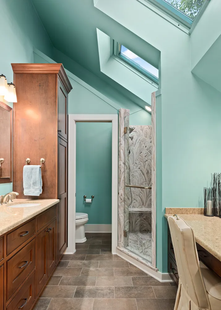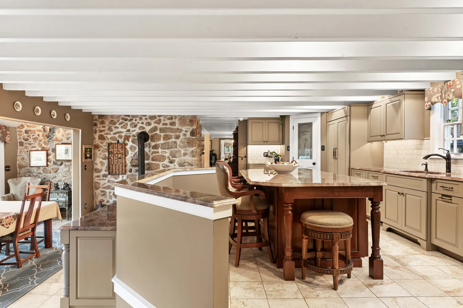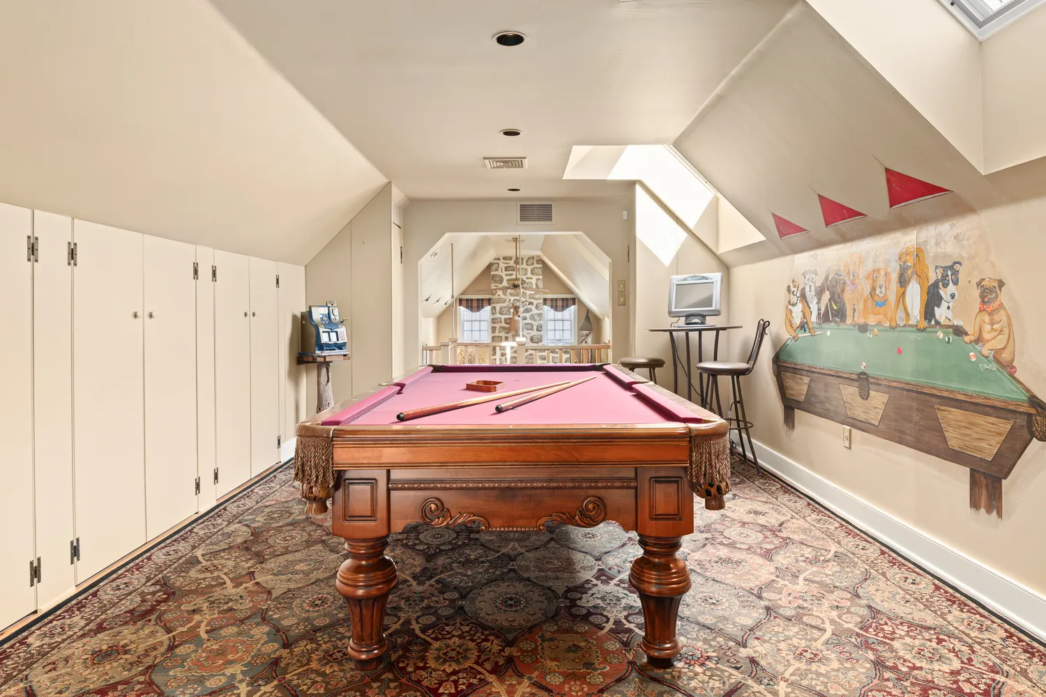 To your left is a stairway to the second level. To your right is the spacious living room/dining room with two fireplaces, one on each side of the room. Whether hosting large gatherings or cozy quiet evenings by the fire on a snowy evening, there could not be a more ideal room for entertaining! Just off the living room is the luxurious first floor primary suite with a walk-in closet with custom built-ins. Its separate sitting room with a fireplace will become your private retreat for relaxation and comfort. An ensuite bathroom features radiant heat flooring, a glass-enclosed shower, a privacy room, dual sink vanity and a separate vanity table. Head to the chef’s kitchen with a massive center island with informal seating, perfect for meal prep and effortless entertaining. This chef’s kitchen boasts abundant cabinetry, a Sub-Zero refrigerator, Dacor double ovens and gas range, granite counter surfaces and a walk-in pantry. The kitchen overlooks the sun-filled informal dining area with a built-in serving buffet with storage cabinets, a beverage refrigerator and a gas stove. You will enjoy the breathtaking views of all four seasons through the three sets of atrium doors, which open to the resort-like setting of the terrace and pool. What a magnificent spot for outdoor dining or enjoying a poolside sunny day! Adjacent to the kitchen is the large family room with its cathedral ceiling, a floor-to-ceiling stone fireplace, custom-built-in cabinets and shelving and plenty of space for comfortable seating. Off the family room is a powder room, laundry room and back door with access to the driveway and 4 car detached garage. A walkway leads to the bank barn and tack room with 8 horse stalls and the tractor barn, overlooking acres of lush pastures, horse and hiking trails. A staircase in the family room leads to the billiard/game room. This room, with a full bath and a wall of closets and storage, could easily be converted into a 5th bedroom. Down the hall, you will find three bedrooms, each with unique features. One includes a loft, ideal for workout equipment or a study. Another has a private sitting room with a fireplace. The third bedroom is currently being used as an office but would make an ideal nursery. A hall bathroom with a double sink vanity and tub and a hall linen closet complete this second level. Slate stair treads lead to the lower level, where all the home’s utilities are located. The space also offers ample storage options.