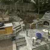 - Exterior Features: Extensive Hardscape, Flood Lights, Stone Retaining Walls
