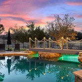 Outdoor living extends effortlessly with a covered patio, fireplace, built in kitchen, and pergola shaded dining area. The pool and spa anchor the yard, complete with a dramatic bridge separating the beach entry from the deep end. Beyond the pool, generous lawn space offers room for games, pets, and gatherings of all sizes.