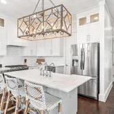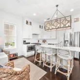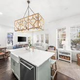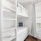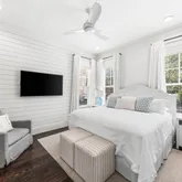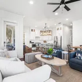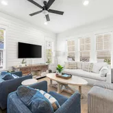 Step inside to find open, airy interiors wrapped in shiplap detailing, relaxed coastal furnishings, and timeless finishes. The kitchen steals the spotlight — with cabinetry extending to the ceiling, stainless steel appliances, a gas range, and a large island with seating that anchors the space for coffee mornings or cocktail prep. The adjoining family room offers plenty of space for dining and gathering, styled with that quintessential beachy charm that feels instantly like 30A. The first-floor primary suite brings privacy and convenience, while upstairs offers a second primary suite plus two additional bedrooms including a cheerful bunk room designed for guests or little ones.