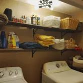 Bathroom/laundry room has long shelves perfect to store your linens and lots of other things, washer and dryer can be included if you want them to be. Lovely wooden sink base with granite type sink and countertop. New shower head, and curved shower rod within the last six months. The tub is deep and spacious perfect for a long hot soak. Two-inch vinyl blinds in the living room and kitchen are included