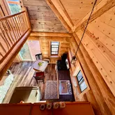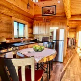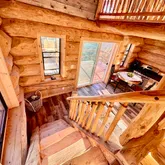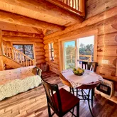 Sitgrieve National Forest. As you tear yourself away from the incredible vista and enter the cabin, you will see the natural beauty continues inside with hickory kitchen cabinets and black hardwood butcher block counters. Porcelain tile plank flooring in rich, earthy colors flows throughout the open floor-plan kitchen, dining, and living area and continues into the main-level, queen size bedroom and adjacent, fully-plumbed bathroom. The bathroom also boasts of a split-log vanity top, decorative bowl sink, a custom-made, tiled shower, and a water-saver toilet. Double-pane sliding glass