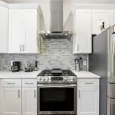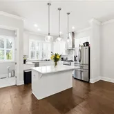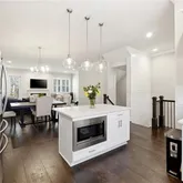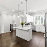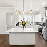 - Kitchen Features: Kitchen Island, Solid Surface Counters, Cabinets White, Stone Counters, View to Family Room