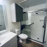 - Room Description: Spacious Master Bedroom with Natural Light from window and Two Closets (one walk in/one standard). Full Closet System in Walk in Closet & Wood Flooring. Full Bathroom Sink area, Cabinet above the toilet area. Walk in Shower with grab bars and pull down seat.