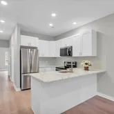 Both units boast gorgeous hardwood floors, sleek recessed lighting, and soaring 9-foot ceilings that create an open and airy feel. The kitchens are a dream – complete with stainless steel appliances, granite countertops, and timeless white shaker cabinets.