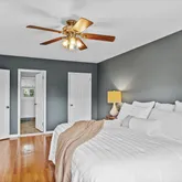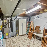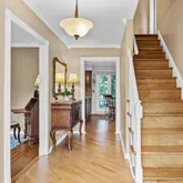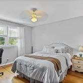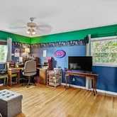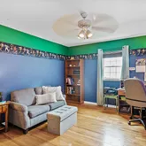The hardwood staircase leads to the second level with hardwood floors throughout. The generous Primary bedroom with walk in closet and ensuite bath is at the top of the staircase. Three large sized bedrooms all with ample closets and ceiling fans and a hall bath with double vanity. The finished basement has been divided into three rooms perfect for a media room, home office, playroom or home gym while the third area hosts the homes mechanicals with wooden storage shelves.
