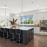 Inside, designer finishes elevate every space. The show-stopping kitchen features quartz countertops, premium Thermador appliances, and double ovens, seamlessly connecting to the main living area where a marble fireplace and panoramic lake views create a stunning focal point. The primary suite is a private retreat with a spa-inspired bath complete with a soaking tub, glass-enclosed shower, and dual vanities.