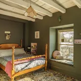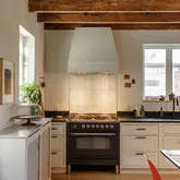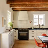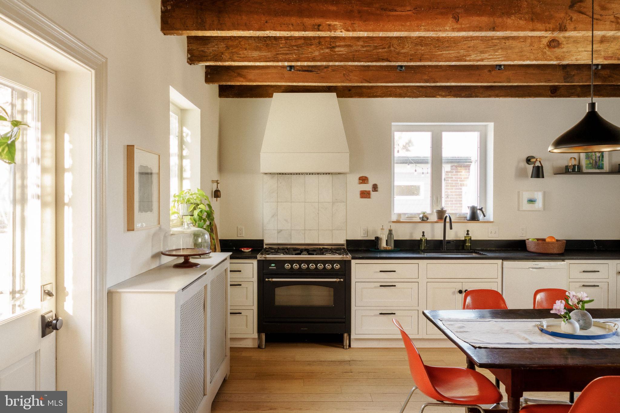 A stone single with a distinctive mansard roof, the home has been thoughtfully reworked with a clear design sensibility and consistent material choices throughout. Exposed rafters, deep-set windows, and layered materials give the home texture and warmth, while modern upgrades — updated systems, central air, and a reimagined kitchen and baths — support comfortable daily living.