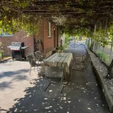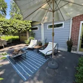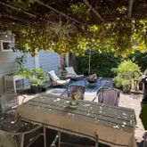 Outside, a courtyard sits beneath a pergola that fills with Concord grape vines each summer — enjoyed as an outdoor dining and lounge area with the feel of a tucked-away European courtyard. Off-street parking for two cars adds everyday practicality.