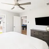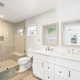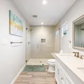 The home features two private primary suites, each with its own spa-inspired bath—ideal for multi-generational living, guests, or a luxe home office setup.