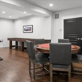 The lower level has been fully reworked to support both recreation and wellness. A custom bar with dual wine coolers, Viking appliances, a large island, and stone backsplash anchors the space. A recreation area, mirrored gym, and a private theater with sound insulation complete this level.