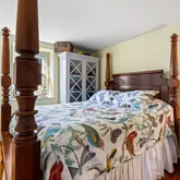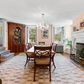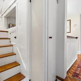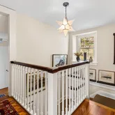 fireplace in the living room is wood-burning. A half bath and closet complete the first floor. Two staircases lead upstairs. Spacious primary bedroom on the second floor with multiple